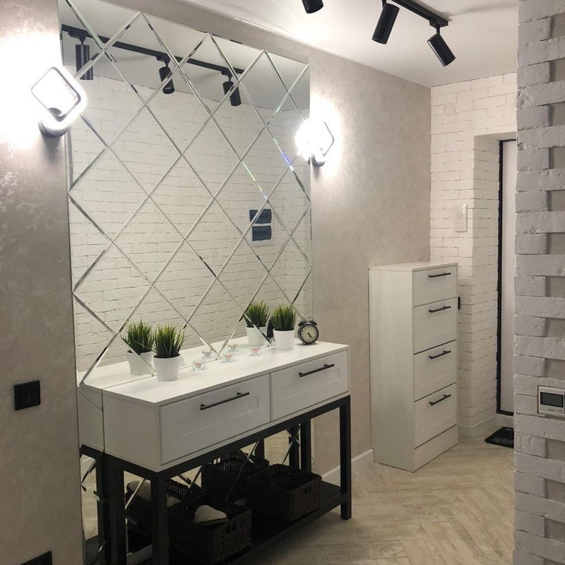 Прихожая – это место, которое обязательно нуждается в зеркале. Каждый из нас привык бросить на себя взгляд перед выходом – все ли в порядке? Так почему бы не сделать зеркало одновременно и декором! Тем более, что это легко решается при помощи монтажа зеркального панно.